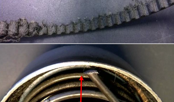 Un canto de la correa de distribución está desgastado de forma circulante. El resorte tensor del rodillo tensor ha sido desgastado o cortado de forma leve o total.